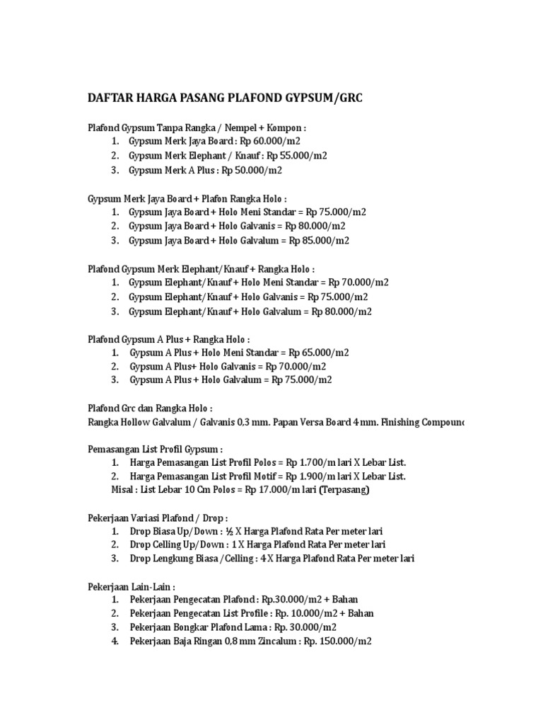 Perkenal kan kami dari griya gypsum, anda sedang mencari informasi harga pasang gypsum murah di jakarta ? Karena keunggulan yang dimiliki grc, maka banyak ahli bangunan yang menggunakan papan semen ini sebagai material tahan air. Dalam mewujudkan kebutuhan anda, kami jual plafon grc murah dengan kualitas bersaing. Plafon grc memiliki harga pasang yang murah, plafon grc juga memiliki banyak kelebihan. .mencari info daftar harga jasa pekerjaan plafon atau partisi gypsum per meter, dibawah ini kami menyediakan beberapa daftar harga pasang hollow galvanis menggunakan papan gypsum merk jayaboard, elephant, knauf dan juga pemasangan lis profil chornice dan harga grc update 2016. Harga pasang plafon di hitung per m2 atau per meter persegi. Karena merk tersebut sudah sangat terkenal sebagai produsen plafon pvc terbaik di indonesia. Didapatkan langsung dari pabrikan tangan pertama sehingga harganya lebih murah dibanding harga jual pasaran. Setiap ukuran 1,2 x 2,4 meter dengan ketebalan 4 milimeter, material plafon. Dibawah ini kami sampaikan daftar harga pasang plafon grc, kalsiboard, dan jayabrix per meter persegi terbaru demikian kami buat daftar harga plafon pasang grc, kalsiboard dan jayabrix per meter ini kepada segenap pelanggan dan pengunjung kami, semoga sesuai dengan yang anda. Plafon gypsum, plafon pvc, plafon. Salah satu pertimbangan yang pastinya nggak bakal kamu lewatkan saat memilih material plafon yaitu harga. Plafon gypsum dan grc sering digunakan dalam proses pembangunan gedung seperti.